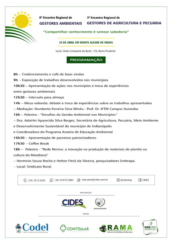 O encontro acontecerá no próximo dia 30 de abril no município de Monte Alegre de Minas. Este é 8º Encontro Regional de Gestores Ambientais e o 3º Encontro Regional de Gestores de Agricultura e Pecuária. Nesta edição, o Consórcio Público Intermunicipal de Desenvolvimento Sustentável do Triângulo Mineiro e Alto Paranaíba – Cides, abre espaço para uma mostra de trabalhos já realizados nos municípios, nas áreas do meio ambiente, agricultura e pecuária.